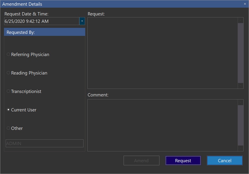 - The Amendment Details dialog box appears. Here the role of the user who is requesting the amendment is provided (current user selected by default), along with the amendment request (optional) & any comments (optional) that is required:
