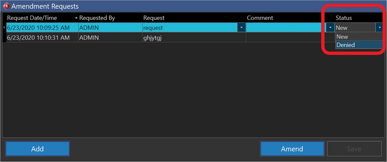 - Click Request to submit the request. This will change the status of the study from SIGNED to TO BE AMENDED.