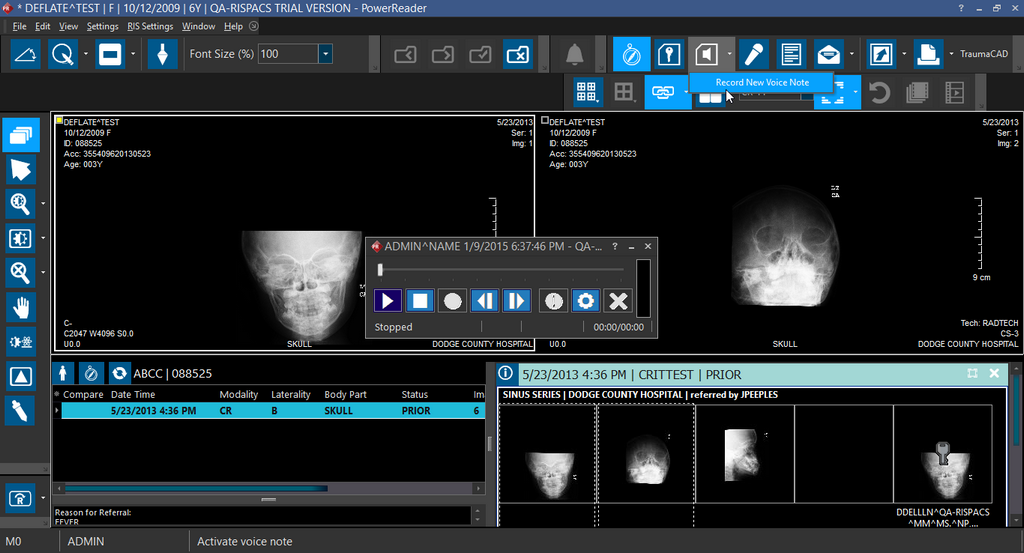 For example, If a study has a saved Dictation and when a user tries to access the other reporting tool, i.e, if a Dictation is open with an ongoing recording/playback and the user activates the Voice note in tandem as shown in the following image.
