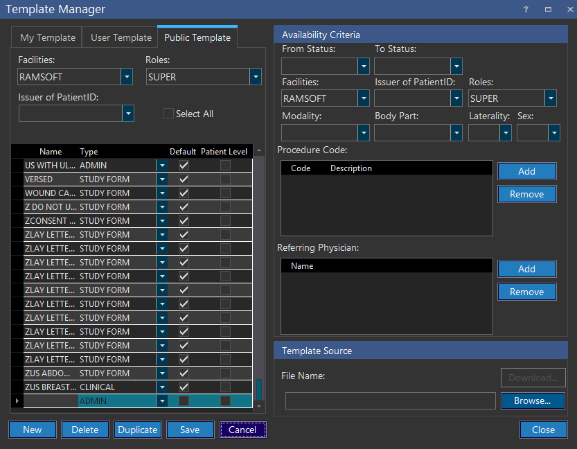 Templates stored in the Public Template section can be viewed by any user. Users can also add new public templates by clicking the New button and defining the required parameters. The Facilities drop-down menu will include all the facilities and the user should choose the facility. If a facility is not chosen, the templates loaded in the list will be those that do not belong to any facility. The Roles drop-down menu can be used to select the roles for which the templates are desired. If no role is chosen, the templates loaded in the list will be those that do not belong to any particular role. The Issuer of PatientID drop-down menu is used to select a particular issuer. When the New button is pressed, the Facilities drop-down menu and the Roles drop-down menu under the Availability Criteria will be automatically populated with the current selection in the Public Template section.