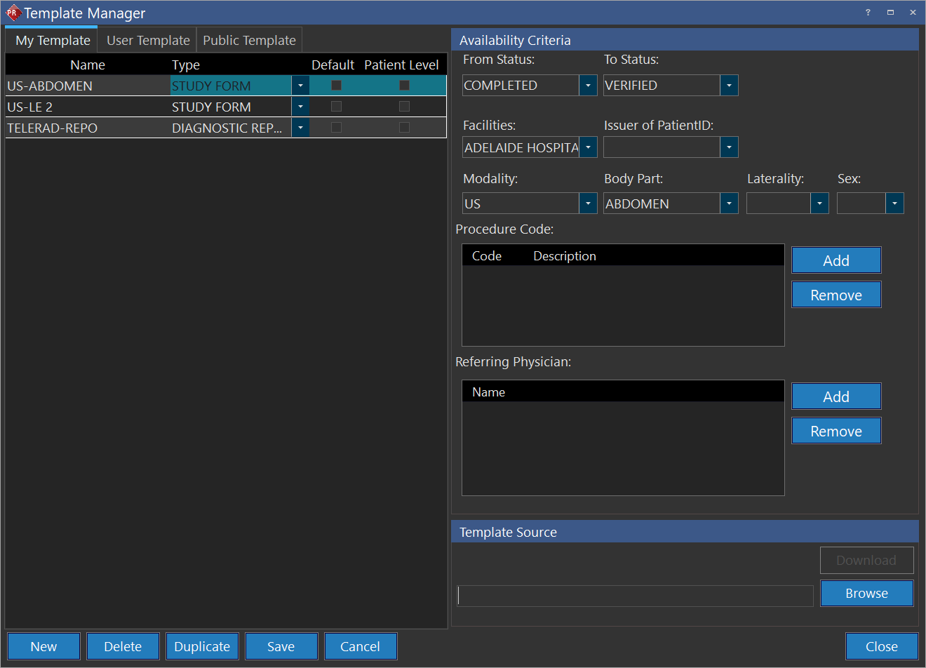 The Template Manager allows report templates to be stored and filtered by certain Users*, Facilities, Study Statuses, Modality, Procedure Codes, and Body Parts. Report templates can be stored and edited by clicking Settings > Template Manager. Template Manager screen appears as shown below. Please note that from PRU10 the window size for the template manager could be changed.