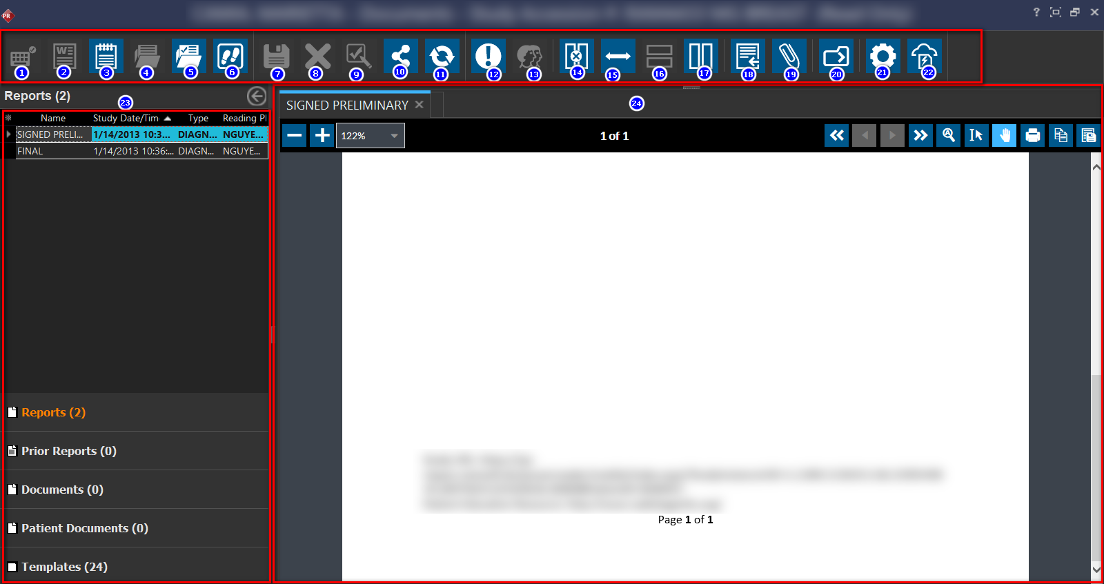 The Documents tool interface is displayed below. The top panel consists of a customizable ribbon with commonly used tools (#1 to #22 below). Below that, the left-hand panel (#23) consists of a list of Reports, Prior Reports, Documents, Patient Documents and Templates. The right-hand portion (#24) contains the report/document editor.