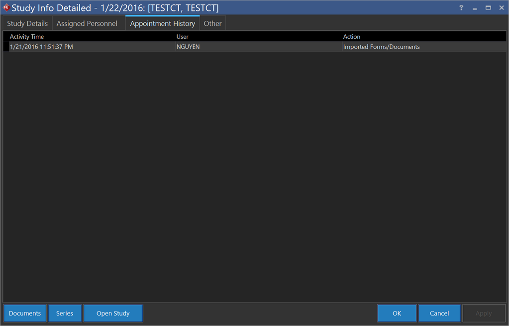 The Appointment History tab allows users to view the appointment history of the study. The tab displays the time when an activity (appointment bookings, cancellations, ordering studies, etc.) took place, the user who performed the activity, and a description of the activity performed.