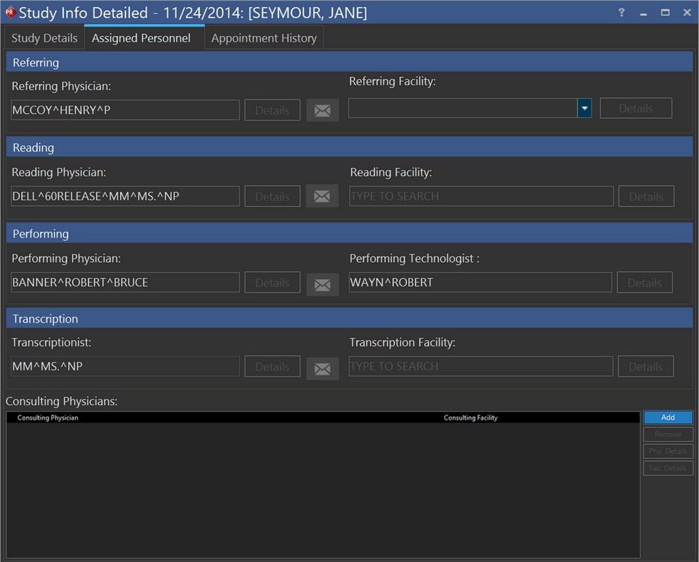 The Assigned Personnel tab allows the user to assign Physicians, a Technologist, and a Transcriptionist to the study.