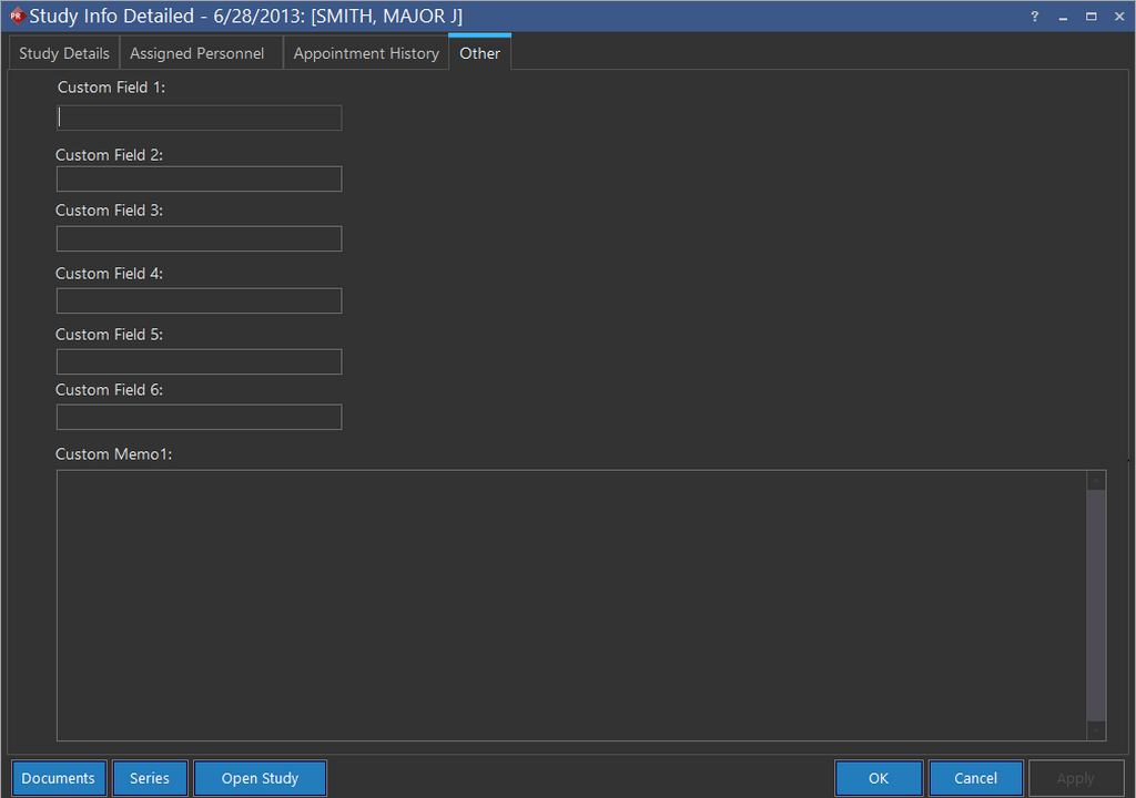 Note that the "Other" tab is only available if you have the relevant License option and the System Configuration entry "Show Study Info Other Tab" selected.