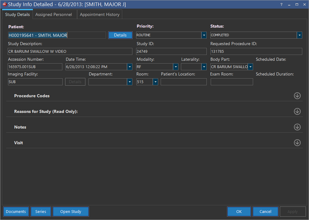Reasons for Study (Read Only): reasons for performing the study can be identified by checking the Diagnosis Codes assigned to the study.