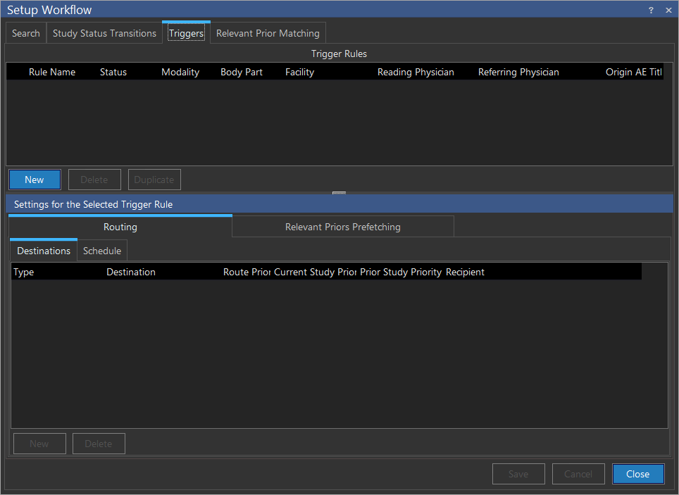 Next you will need to choose the destinations that this rule will be sending the studies to. To do this, make sure the Destinations tab is selected in the bottom half of the dialog and the desired rule is highlighted in the list of Trigger Rules. Click the New button to add a new row to the Destinations area. From the Destination drop-down menu choose the desired machine. If you want to route to a PowerReader/PowerCache, you will first need to change the Type from DICOM Station to Client. This will change the list under Destinations from all the available DICOM stations to all the available PowerReader clients. Next, you will need to choose whether relevant prior studies should be routed along with the study that triggered the routing rule. Toggle the Route Prior check mark on or off to indicate this decision.