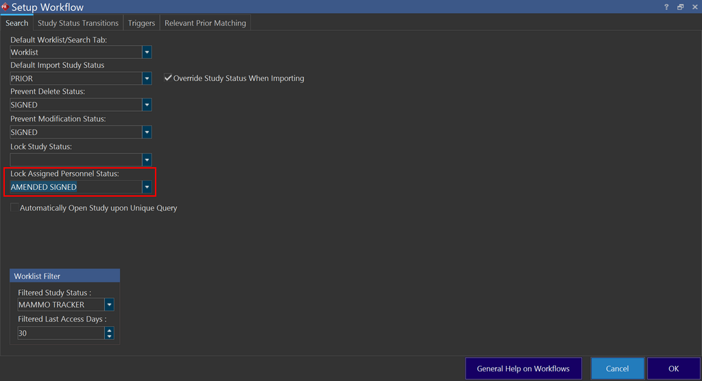 Once a Study reaches a certain status, we can prevent any changes to assigned personnel status when the study reaches a certain status. This can be accomplished by using the Lock Assigned Personnel Status option under the Search tab in Server Settings > Workflow.