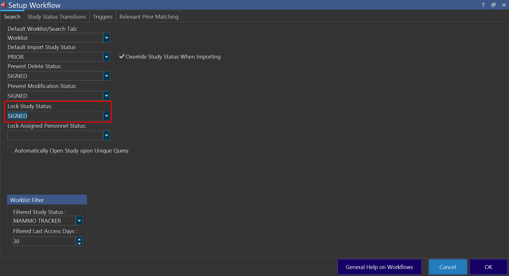 You can if required prevent users from changing the status of a study backwards once the study reaches a certain status. This can be accomplished by using the Lock Study Status option under the Search tab in Server Settings > Workflow.