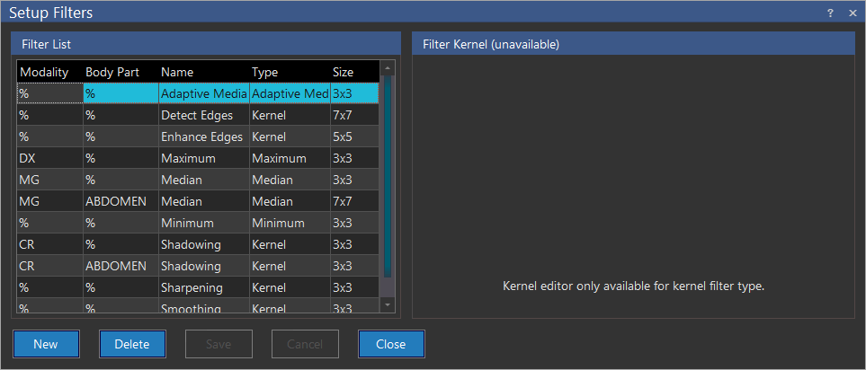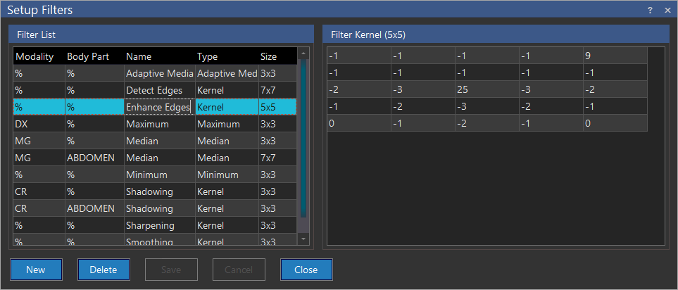 A new Filter can be added by clicking the New button. This will add a new row to the list. If the filter Type is set to Kernel, this will open the filter matrix. This matrix needs to be manually edited in order to achieve the desired values.