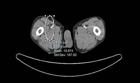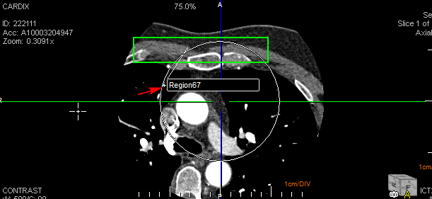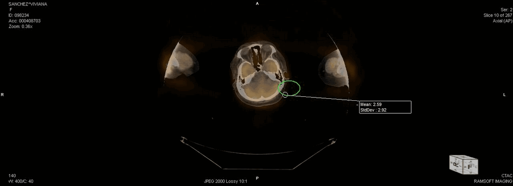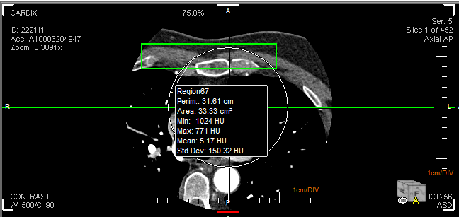 For CT images, the ROI tool will display the Mean and Standard Deviation of the ROI.