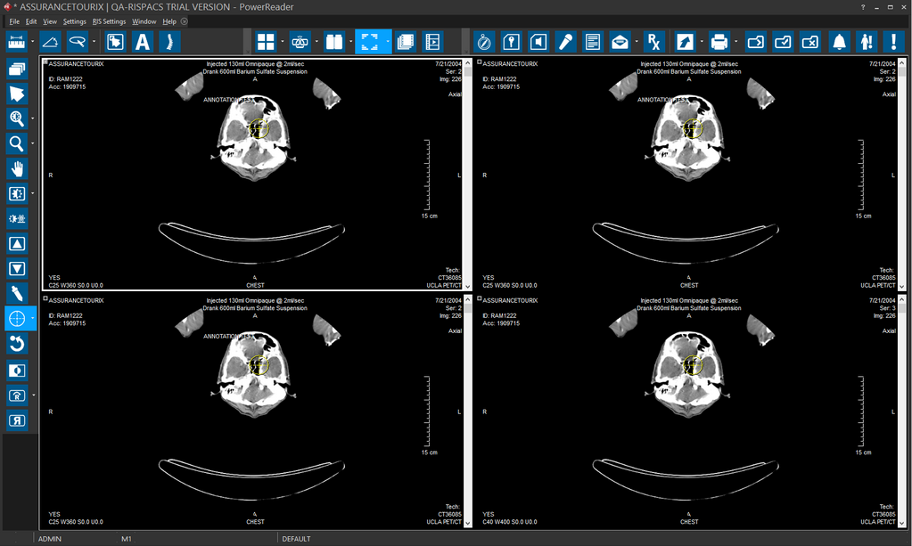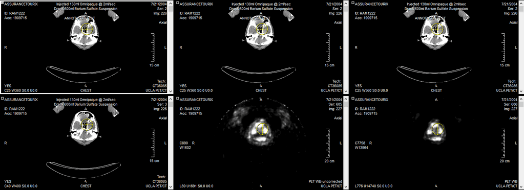There are four Image View boxes visible on the screen above. In the event that a suspected area has been found and the user wants to view every image in the study that contains a view of it, clicking the area brings up every single possible view of that point. In the example below, this translates to a total of six images being displayed on the screen for that specific point.