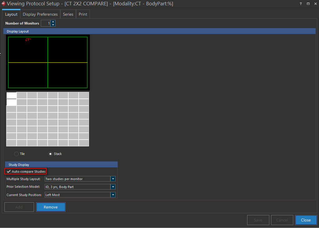 The Compare option settings are controlled by your Viewing Protocol set up. You can compare up to four studies per monitor if you set up your Viewing Protocol for 4 monitors.