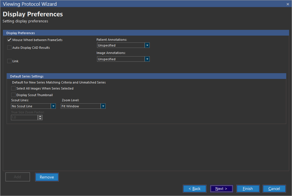 Save the Display Preferences. If you wish to make any further changes to the viewing protocol, click Next and complete the protocol according the instructions provided in the section How Do I Create a Viewing Protocol.