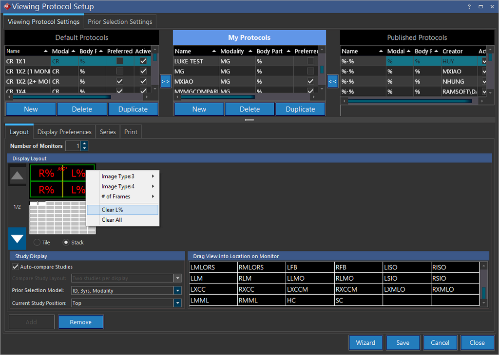 In the Drag Image type into Location On Monitor you will notice various Mammo views. There are two generic views of R% (Right) and L% (Left) which are used to match unknown views based on whether they are the left or the right breast. There are 58 types of view (image types) for mammogram images and they are all labeled accordingly. Drag and drop the desired Image types from the bottom right to the display layout.