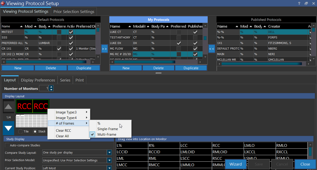 Viewing Protocols can be set up for different image types. 3D Tomosysnthesis images can be identified as Multi frame images and 2D synthesized images are identified as Single Frame images by default. You can assign the number of frames for any of this image types by selecting the # of Frames option from the right-click menu on the Display Layout section.