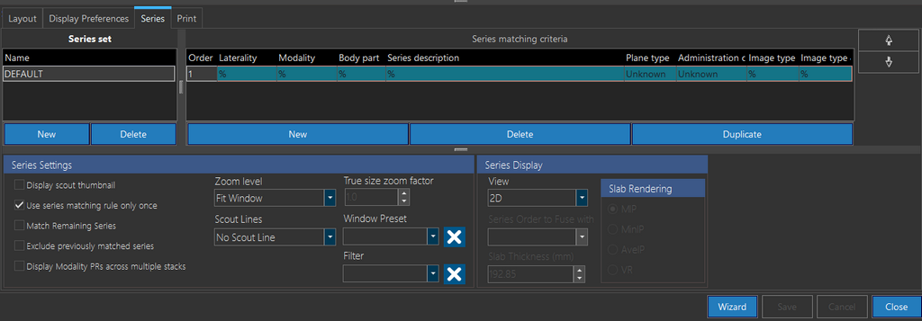 Finally, the Series Display section with the View drop-down menu is used to create rules for a Fusion (2D), MPR or Slab MPR series. The rules can be saved as a part of the viewing protocol like any other rule. The 2D option is the default option and used when the study being shown is not MPR series. This will be the default view in most cases. The MPR option will be used when displaying any normal MPR series. The Slab MPR option will be used to create an MPR viewport along with a Slab view. If the user chooses this option, the various rendering parameter options become available to the user. The options are MIP (Maximum Intensity Projection), MinIP (Minimum Intensity Projection), AveIP (Average Intensity Projection) and VR (Volume rendering) and will be applied to the viewing protocol according to the view desired by the user. The Slab Thickness option allows the user to adjust the thickness of the slabs used in the MPR.