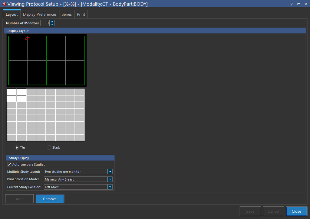 Now you have to decide how many series of images you will like to view at once. How many images of each series will be visible at once is not relevant here, that will be decided later. You can choose to layout of the images on the monitor by choosing the Tile or Stack option and choosing the number of images in the Monitor Graphic above. As a result, each monitor can be tiled or stacked individually allowing you to mix and match as desired.