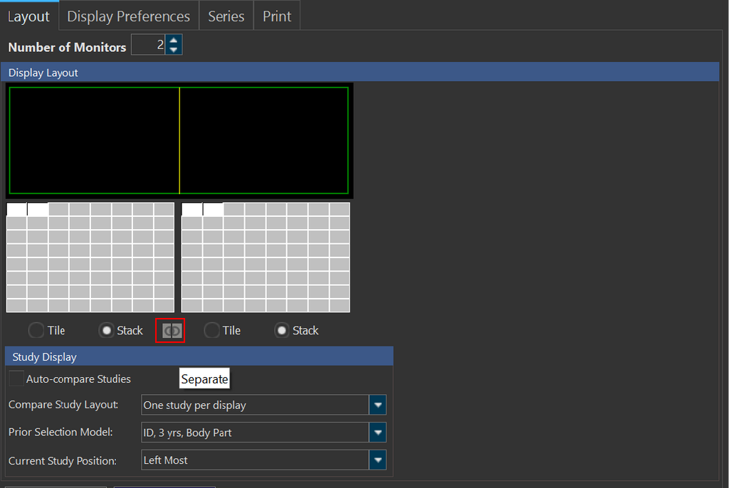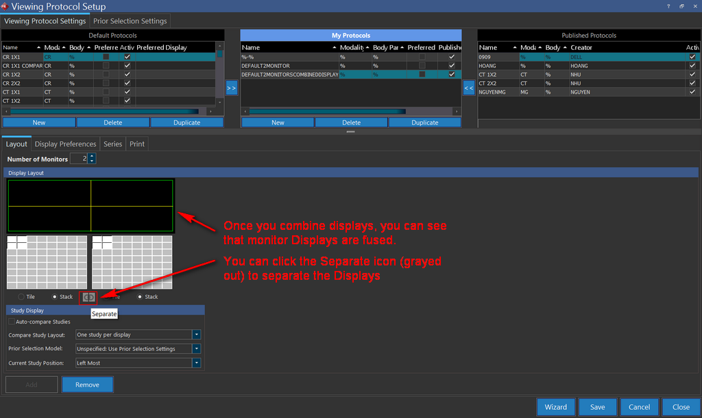 You can undo combing displays by selecting any of the other layout options(All Displays or Selected Display) from the Setup Layout Multiple Viewports tool menu on the study desktop or by clicking on the Separate icon in the Viewing Protocol setup Settings tab. Note that