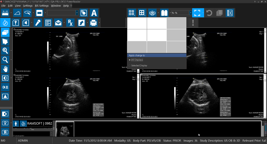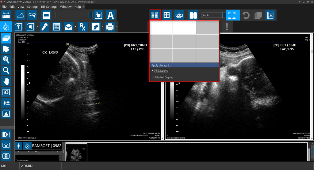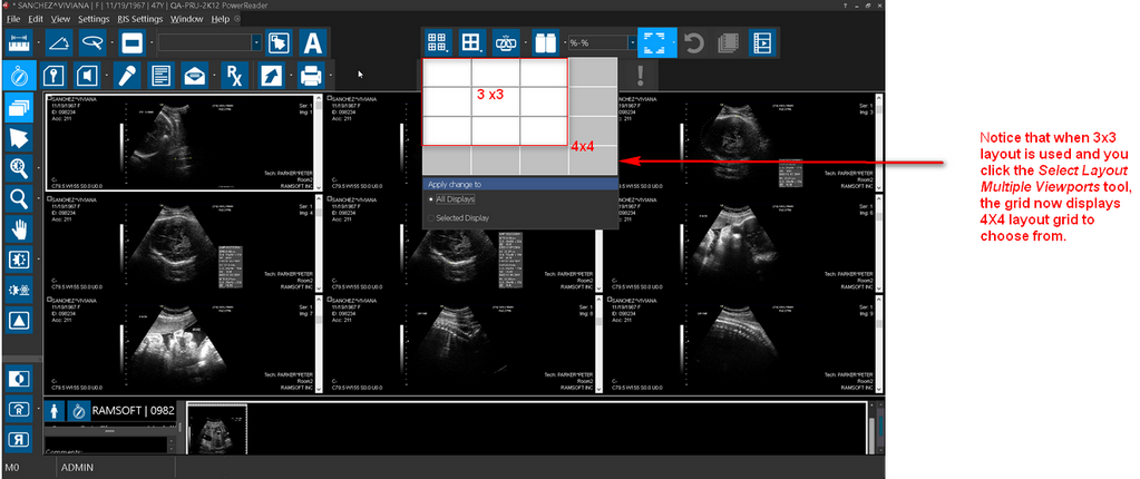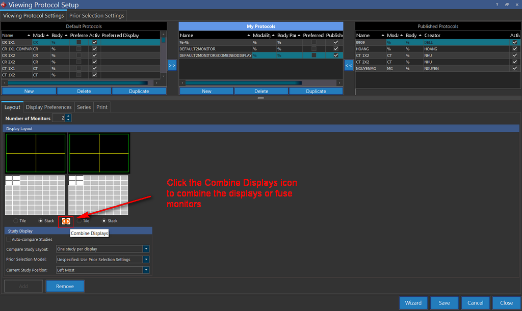 You can save your settings and then apply this viewing protocol settings for your image display layout. When you are on a study that has a combined display layout, you can see that the Setup Layout Multiple Viewports tool has an additional option for you to apply the layout changes to.