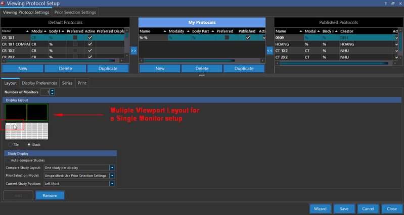 You can save a multiple Viewports layout as a viewing protocol. When you set Layout Multiple Viewports to more than one, the Viewing Protocol gets saved or updated as a Stacked layout. Only when you set Layout Multiple Viewports to one, the current layout, the Viewing Protocol gets saved or updated as a Tiled layout.