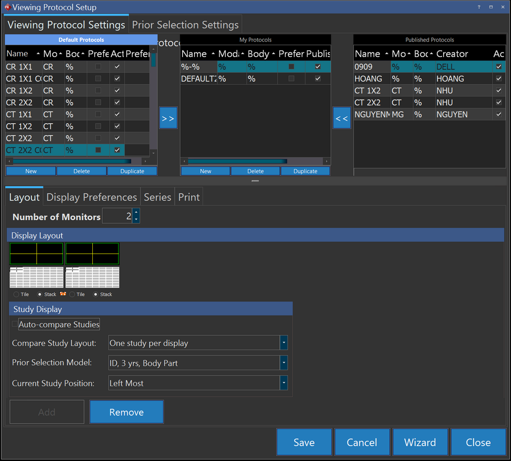 Once you set the Number of Monitors field as 2, you can select the desired multiple viewports layout settings and save the Viewing protocol settings. Once you do this, when you open the study in a multi-monitor setup, the appropriate viewing protocol setup for multi monitor display is applied.
