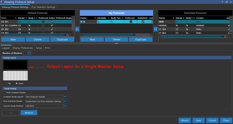 For a single monitor setup, the default viewing protocol setup with a single viewport layout is as follows: