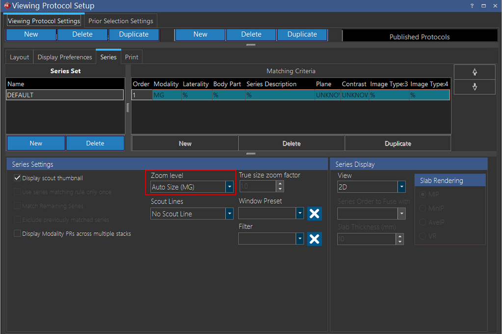 Click on the Series tab. This tab consists of additional options that can be used to tweak the protocol. One of the options listed is the Zoom Level menu which enables a study to occupy the whole viewport rather than a portion of it. The enhancement allows the Radiologist to view the study in detail.