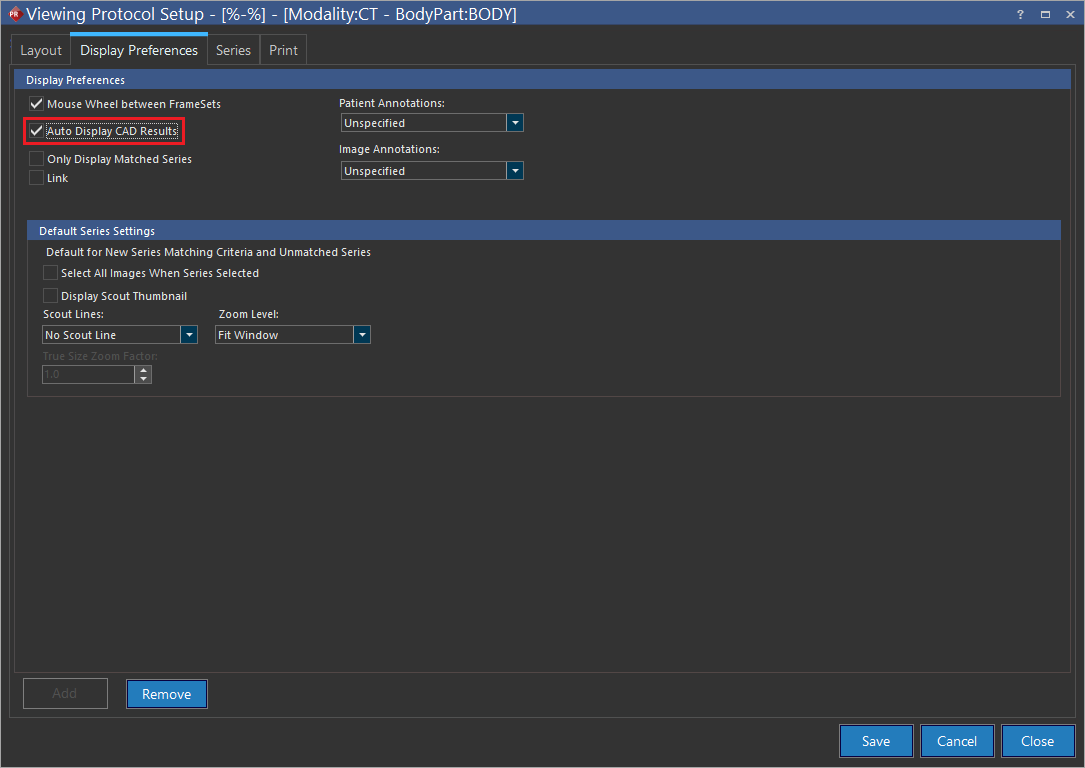 CAD markers can be auto enabled/disabled when a Mammography study is loaded in the Image Viewer. The option is selected from the Display Preferences tab of the Viewing Protocol Setup window.