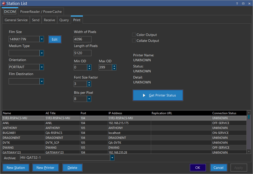 In the Print section of the Station List you will be able to configure options that are specific to DICOM printers. Any settings you configure will apply only to studies sent to the currently highlighted printer in the list.