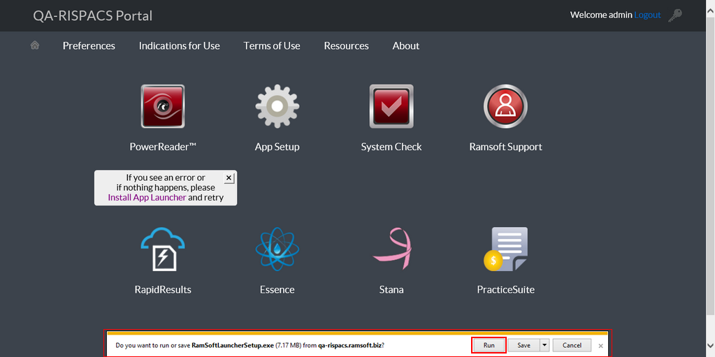 - Click Install App Launcher. The options to run or save the RamSoftLauncherSetup.exe file appear in a pop up message. You only see this pop up message when you are installing the PowerReader client for the first time. When you are upgrading to a higher version of PowerServer, the app launcher is automatically upgraded.