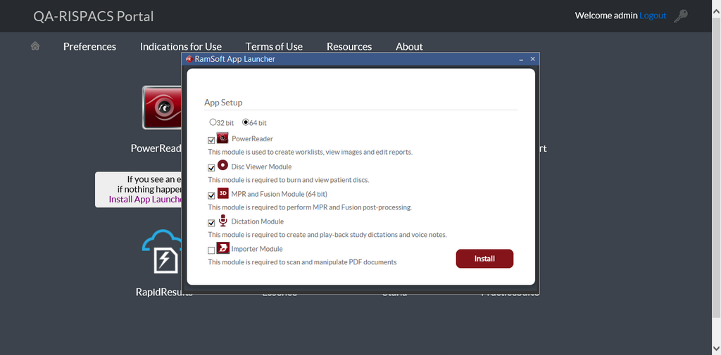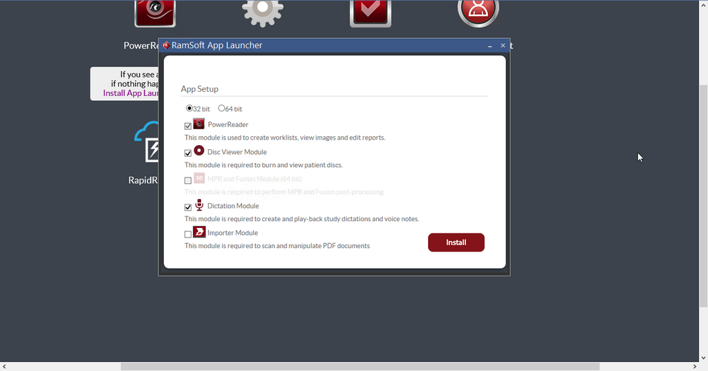 Note: The PowerReader option is selected by default. Based on the user role setup in Maintenance module, the other install options in the App Launcher would also be pre-selected by default.