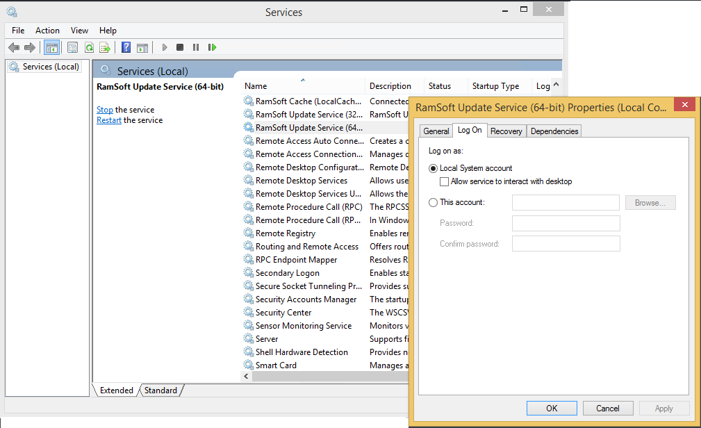 PowerReader installer installs the RamSoft Update Service to log on as Local System Account.
