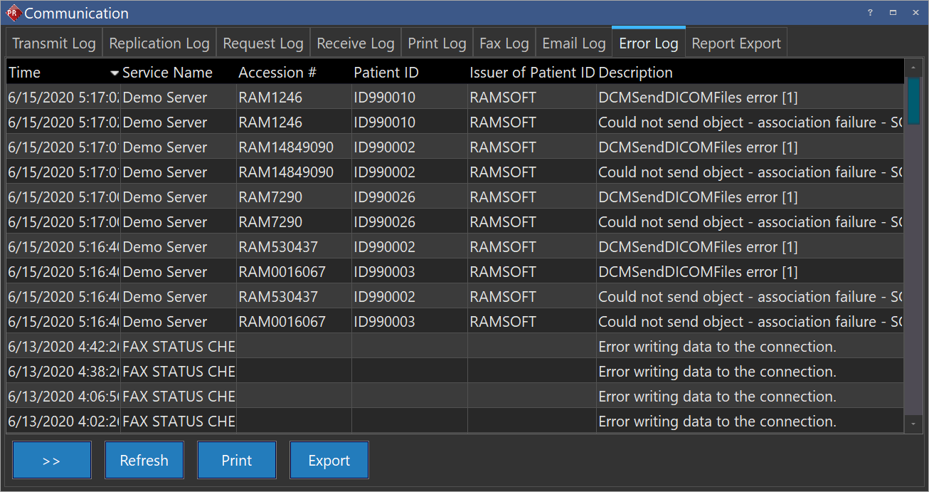 The RamSoft software maintains a list of all the errors and warnings that occurred during DICOM communication with other systems. This list is accessible by clicking Settings > Logs > Communication > Error Log tab.