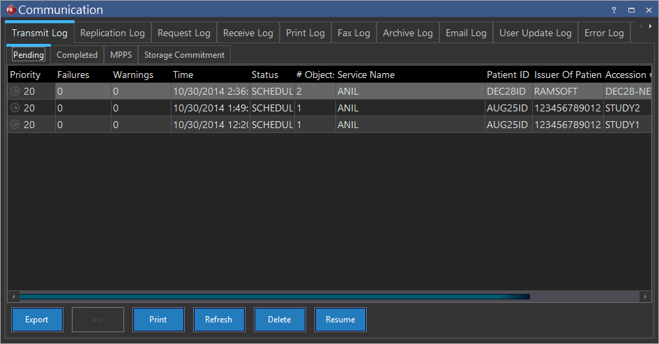 If an MPPS transfer failed, it can be manually restarted by highlighting it and then clicking on the Resume button. An MPPS of a study can be deleted from the MPPS Pending Log by selecting the study and clicking on the Delete button.