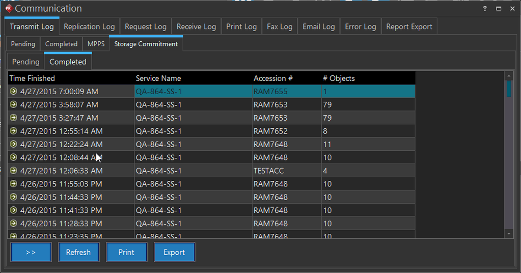 The RamSoft software maintains a list of all the studies that are currently being transferred, are queued up to be transferred, or have been transferred out of the system. This list is accessible by clicking Settings > Logs > Communication > Transmit Log tab.