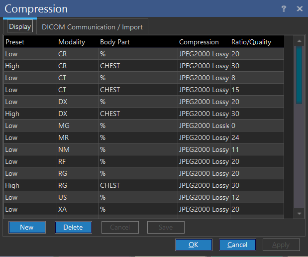 This dialog permits the creation of display compression presets. To create a new preset, click New and enter a name in the Preset column. The name should be easily identifiable to the users of the system. Next choose the Modality and Body Part to be associated with the new preset. The % is a wild card which applies the preset to all possible body parts or modalities.