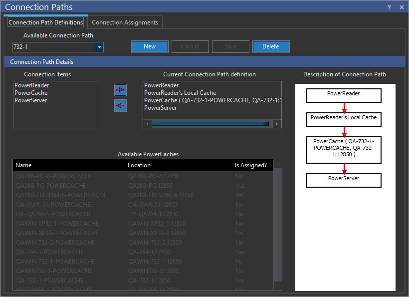 Next, choose the path to be deleted from the Available Connection Path definitions dropdown menu. Press Delete to remove the Connection Path. Any nodes that belong to the deleted Connection Path will now become unassigned. Hence, PowerCache will be used by the other Connection Paths it is a part of. If no other Connection Paths are defined, the PowerCache will remain idle. The PowerReader client will inspect the Connection Path list, and if no other Connection Paths are available, it will establish connection with the "DEFAULT" connection path.