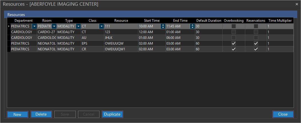 Resources are the different types of internal facilities of a department. This feature allows you create, modify, delete, and duplicate the internal facilities of a department.