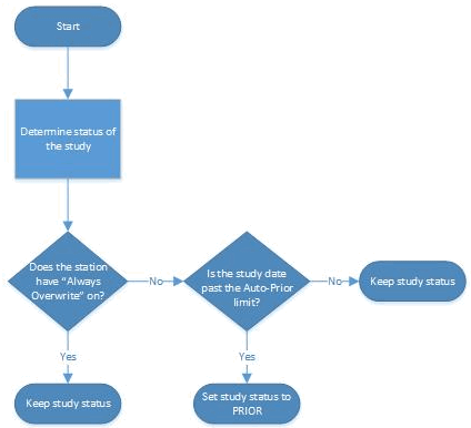 If 'Receive Status' on station list is blank then received objects STATUS is applied if it is a valid status and a greater status than the current study status. Auto prior rule is applied, that means if study date/time is older than 30 days, the study status is set to PRIOR. If no objects are saved (older/invalid) from the newly received objects, then study status is not updated.