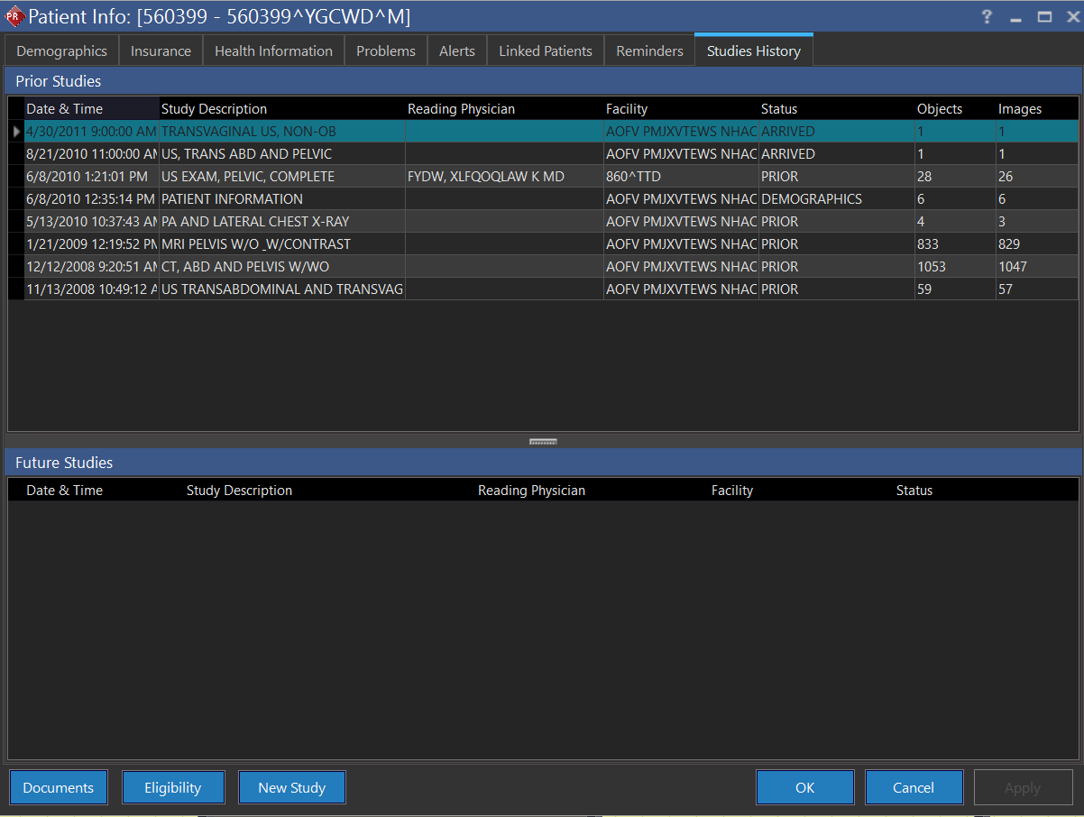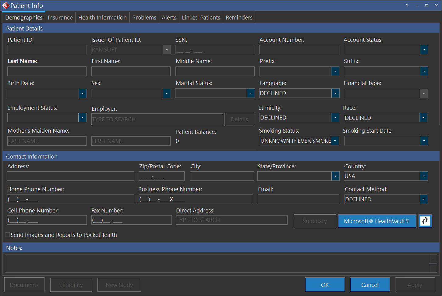 For RIS-enabled licenses, more features are available in the Patient Registration form. Please see the section Patient Info (RIS) for more details on these features.