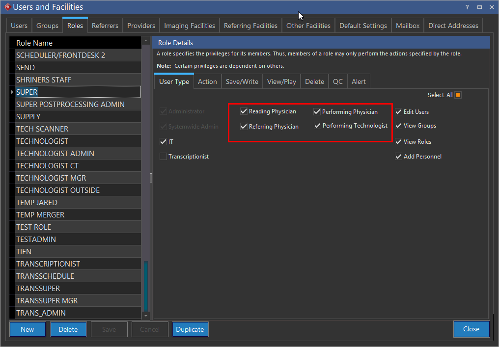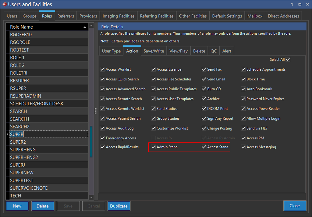 Note that the SUPER and RAMSOFT users have the Access Stana and Admin Stana privileges enabled by default.