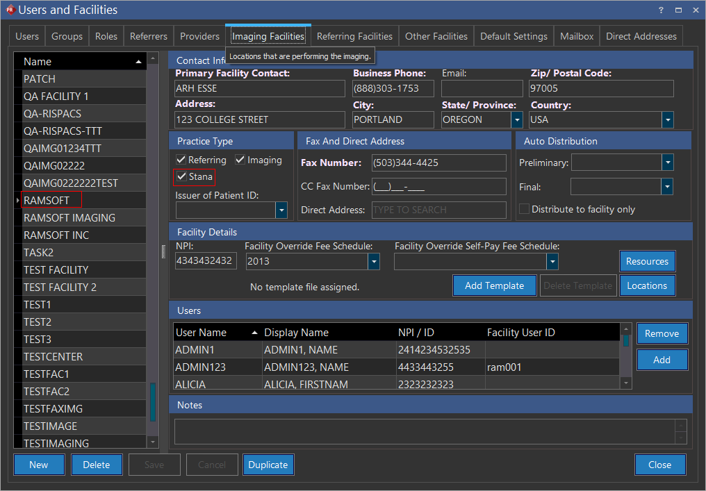 Login to PowerReader and go to Settings > Users and Facilities > Imaging Facilities. Note that the Stana option in the Practice Type section is not checked off by default.