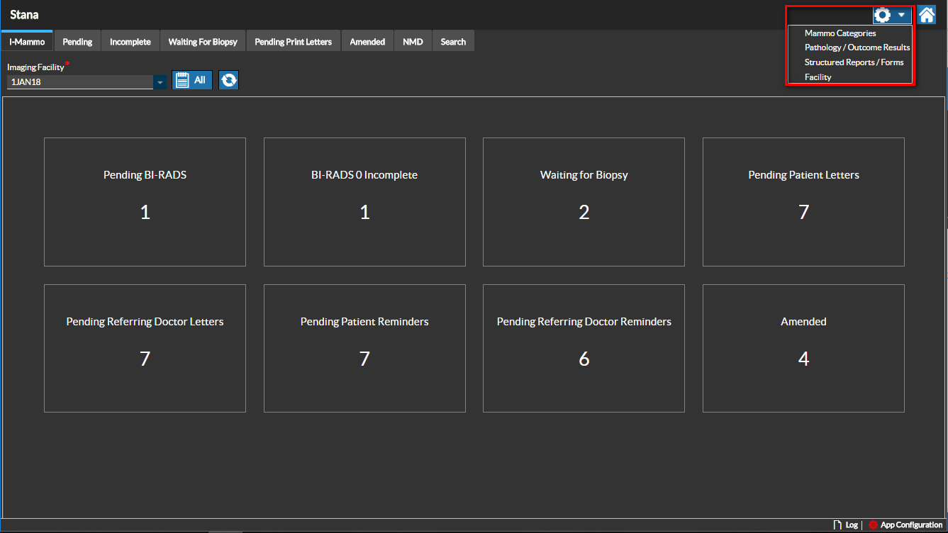 - Pathology and Outcome settings can be configured for a specific facility through the Settings drop-down menu.