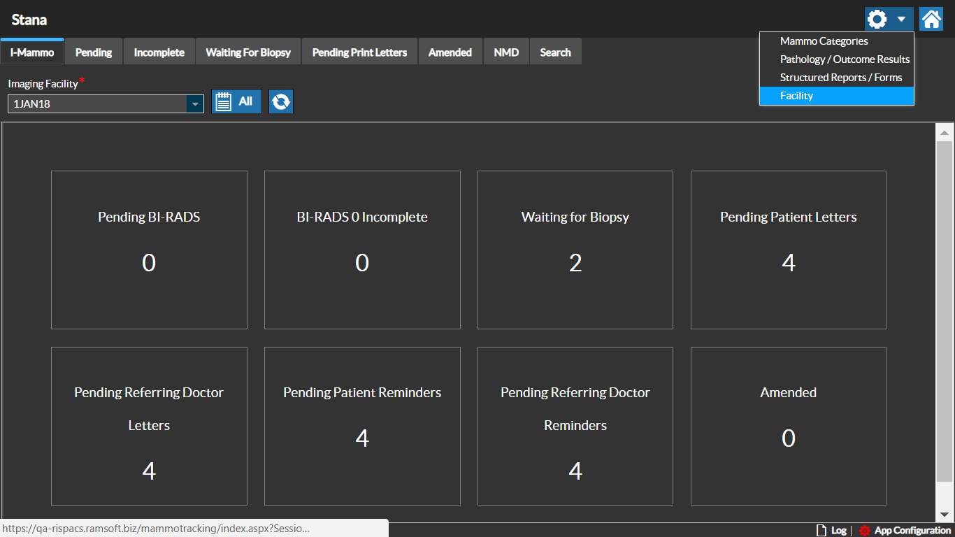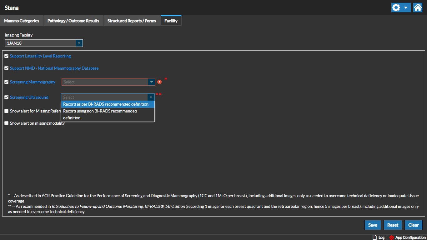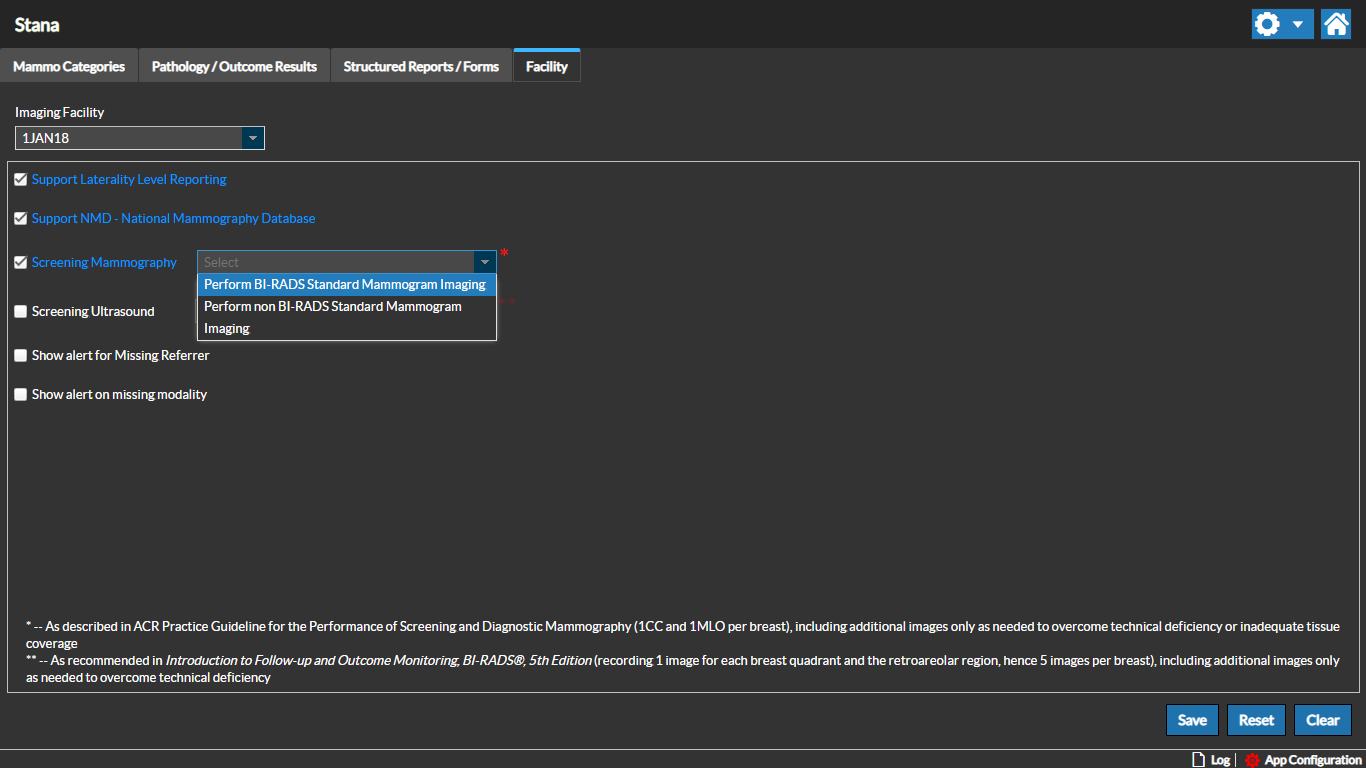 The Facility tab in Settings is used to select various options unique to the Facility. The Screening Mammography and Ultrasound options for BIRAD can be configured. Click the Settings icon and select "Facility" to access this screen.