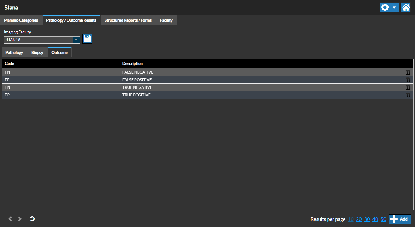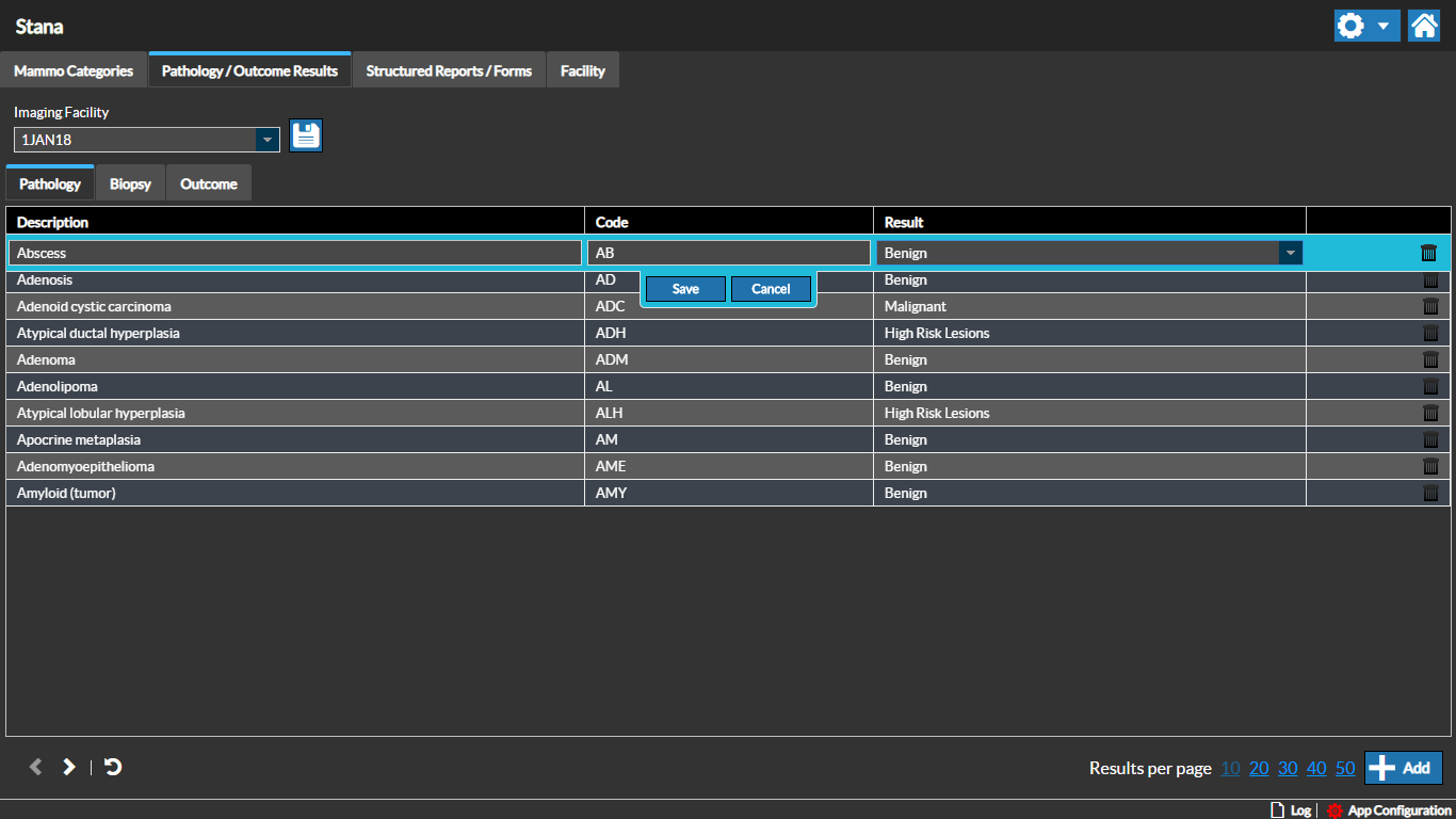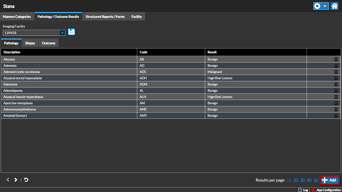 You can view the Biopsy Code, description and the results on this screen. You can also add a new Biopsy Code by clicking the Add button.