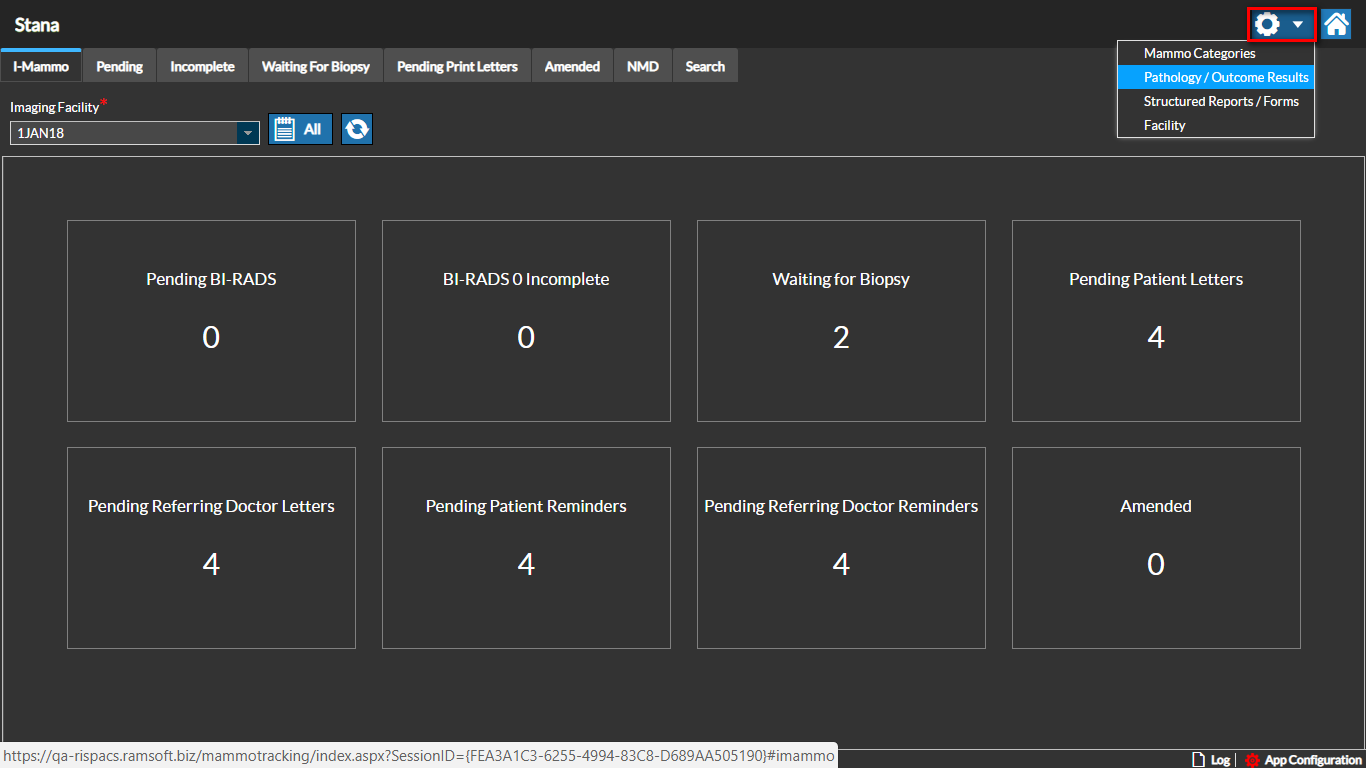 You can configure Pathology and Outcome settings for a specific facility through the Settings drop-down menu.