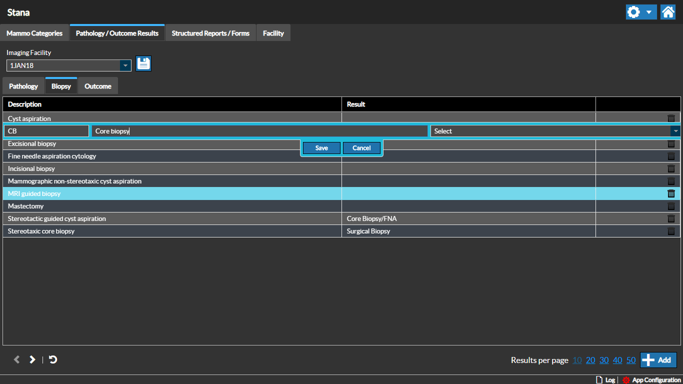 You can add or edit the list of Biopsy Procedure types for the selected Imaging facility by clicking the Biopsy tab.
