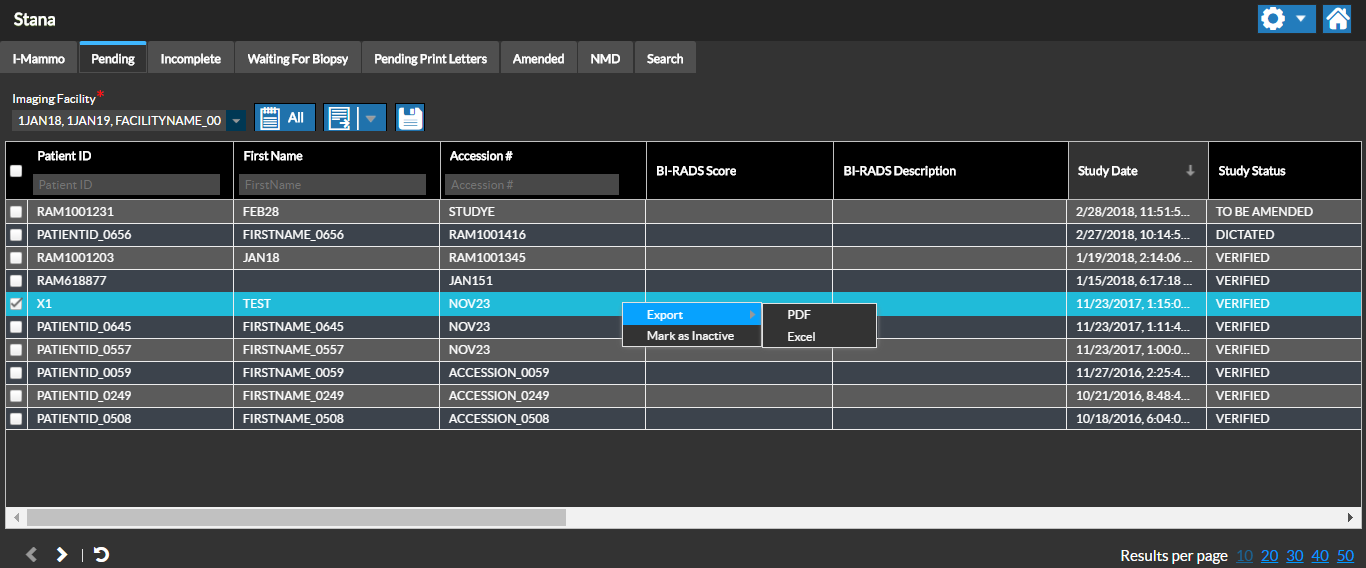 At any time, right-clicking the study list displays the Export option to export the details on the screen to a PDF or Excel file.