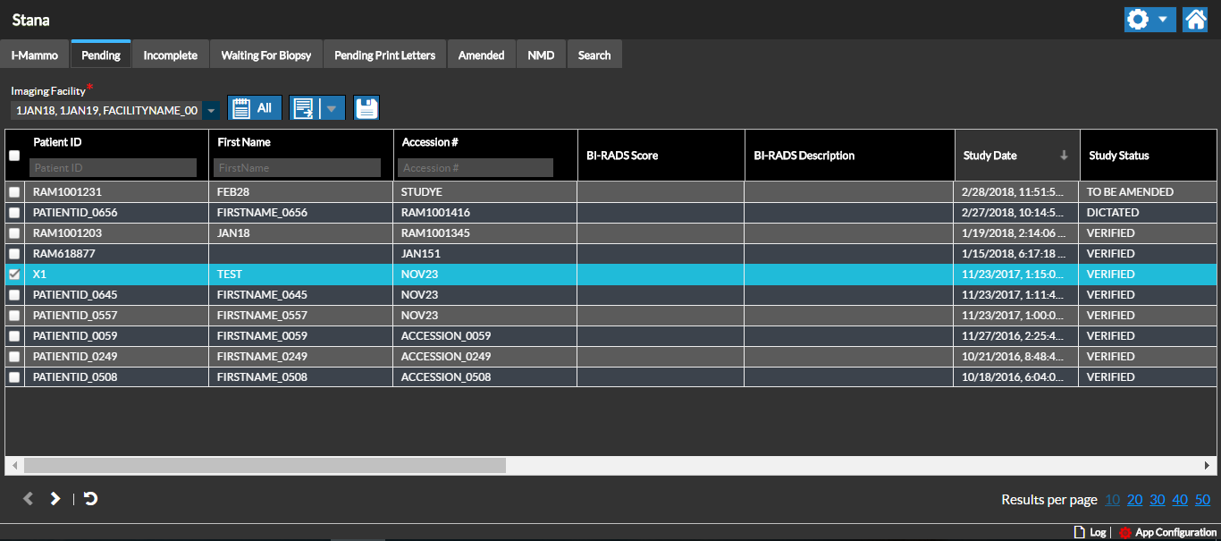The Pending screen Worklist displays all the Stana Studies that are pending for the selected Imaging Facility. The number of pending studies for a given time period can be viewed by selecting the desired time period using the Calendar. When a user creates a Stana study in PowerReader, the number count of Pending Studies tab in Stana Web goes up by one.